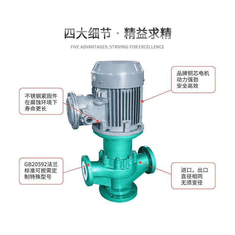 - GFMC氟塑料立式磁力管道泵是一種采用立式安裝方式,具有耐腐蝕泵的優(yōu)點(diǎn)無(wú)泄漏管道磁力泵,泵進(jìn)出口徑相同,結(jié)構(gòu)緊湊、占地面積小、進(jìn)行無(wú)泄漏運(yùn)轉(zhuǎn);且位于同一中心線上,材質(zhì)優(yōu)良,泵體、葉輪、隔離套等過(guò)流部件均采用氟塑料合金制造,葉輪直接與電機(jī)軸連接,高效、節(jié)能、低噪音,能有效的平衡泵運(yùn)轉(zhuǎn)產(chǎn)生的徑向和軸向負(fù)荷;
